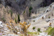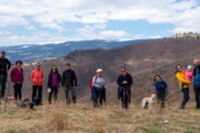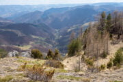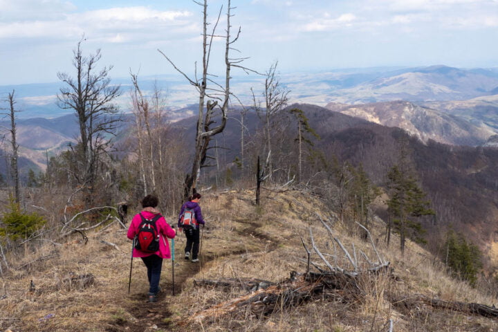 - Miután feltöltődtünk és kigyönyörködtük magunkat a virágoskerten és a tavaszi színeken, egy felperzselt erdei fenyőliget mellett eregetjük lefele Felsőpodsága irányába.